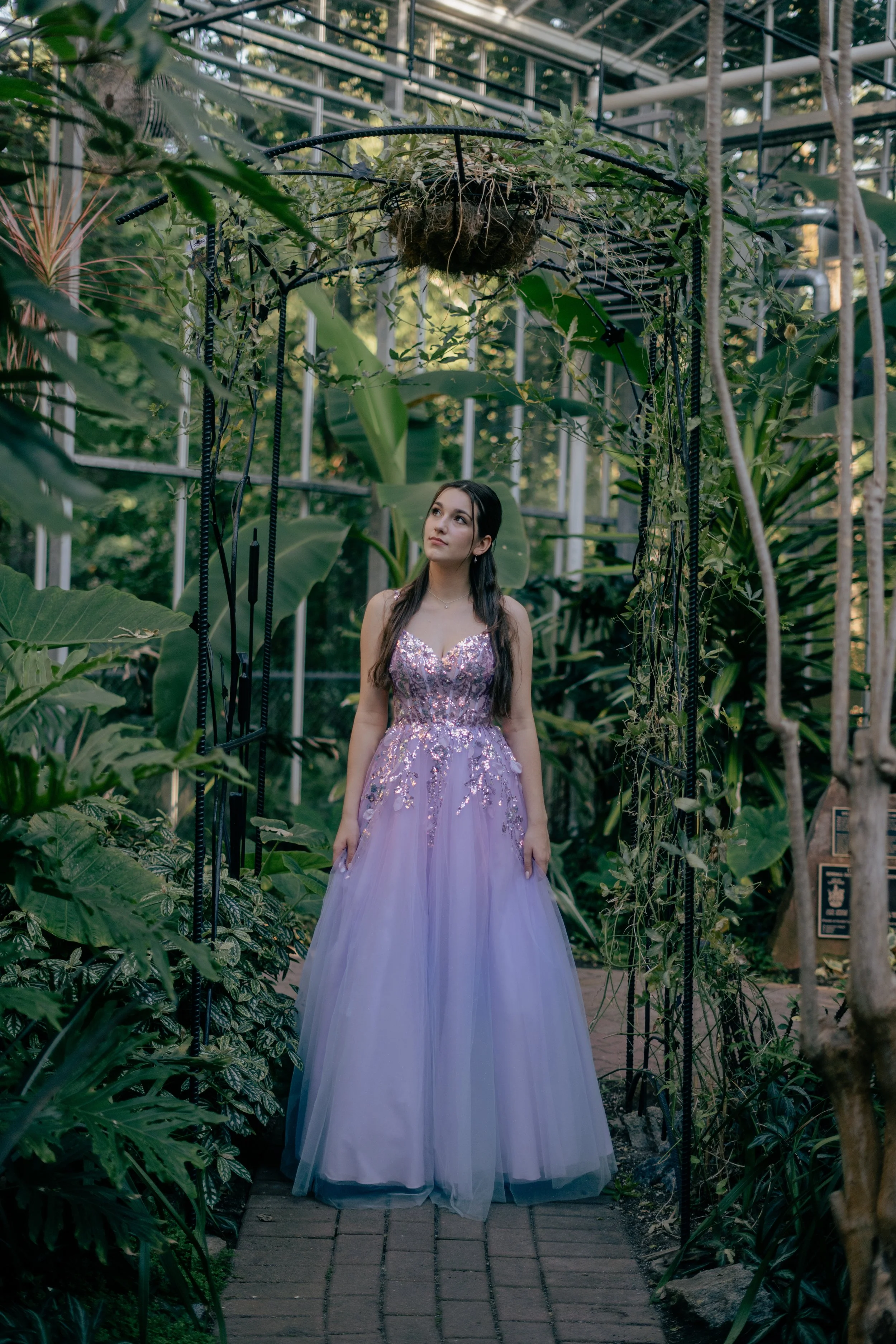 Woman in a sparkling lilac gown stands in a lush greenhouse surrounded by tropical plants. View fullsize