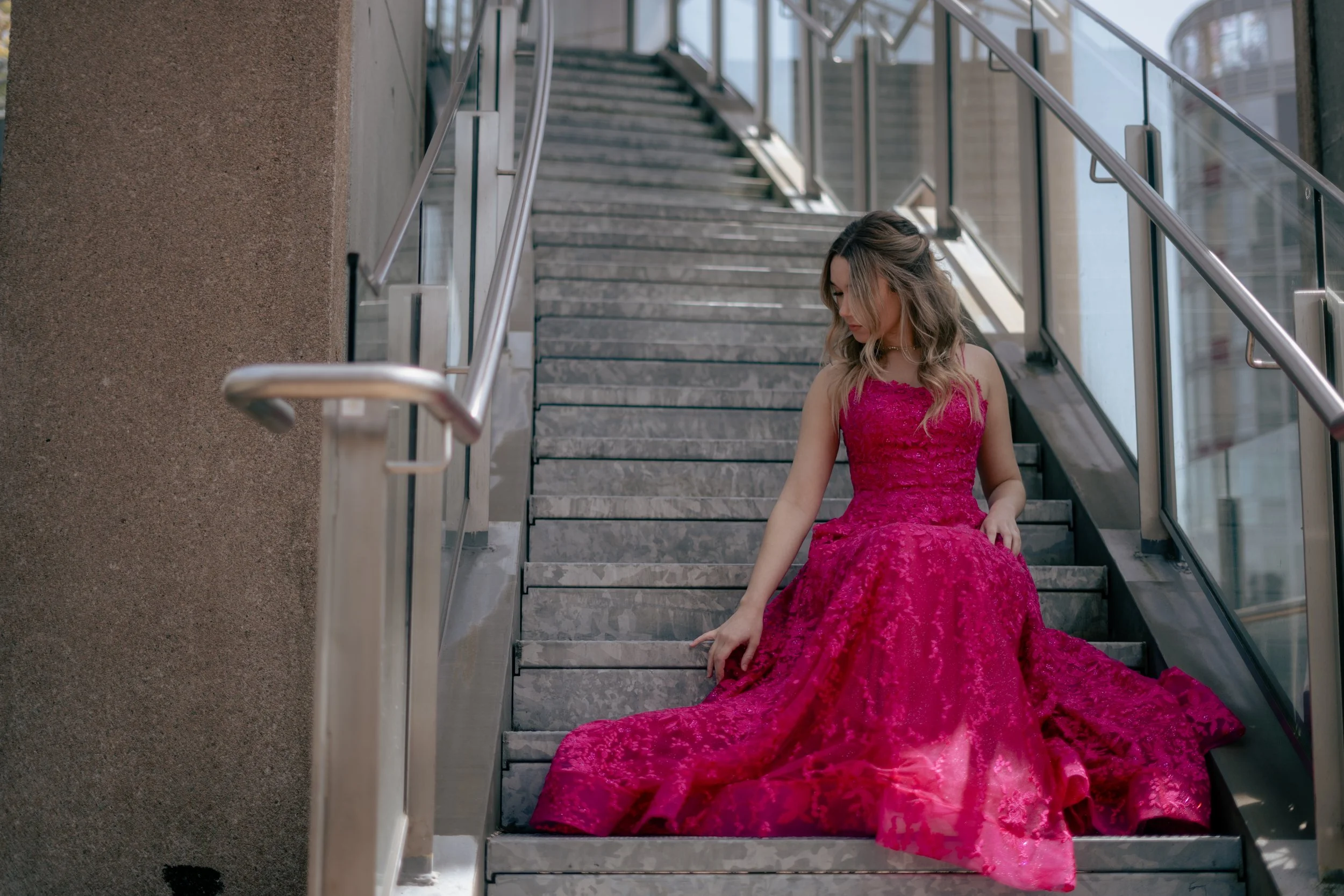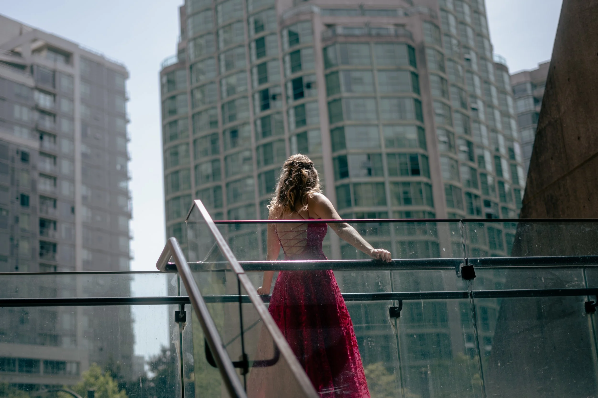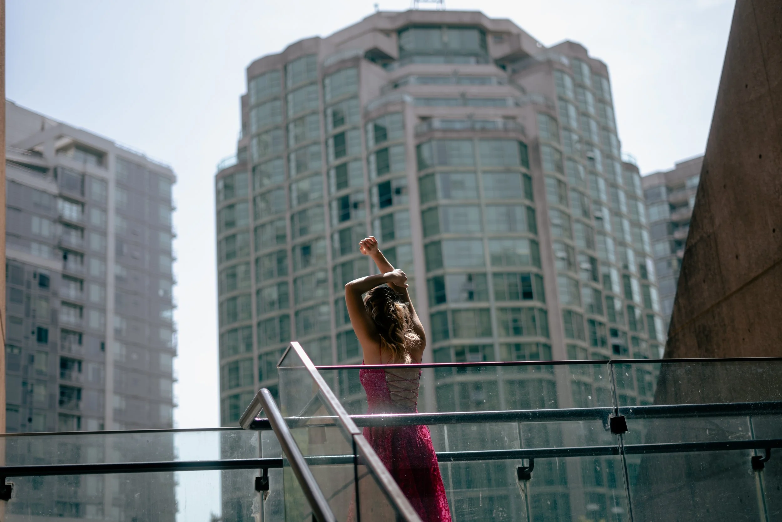 Woman in pink dress on a glass-railed staircase with tall buildings in the background