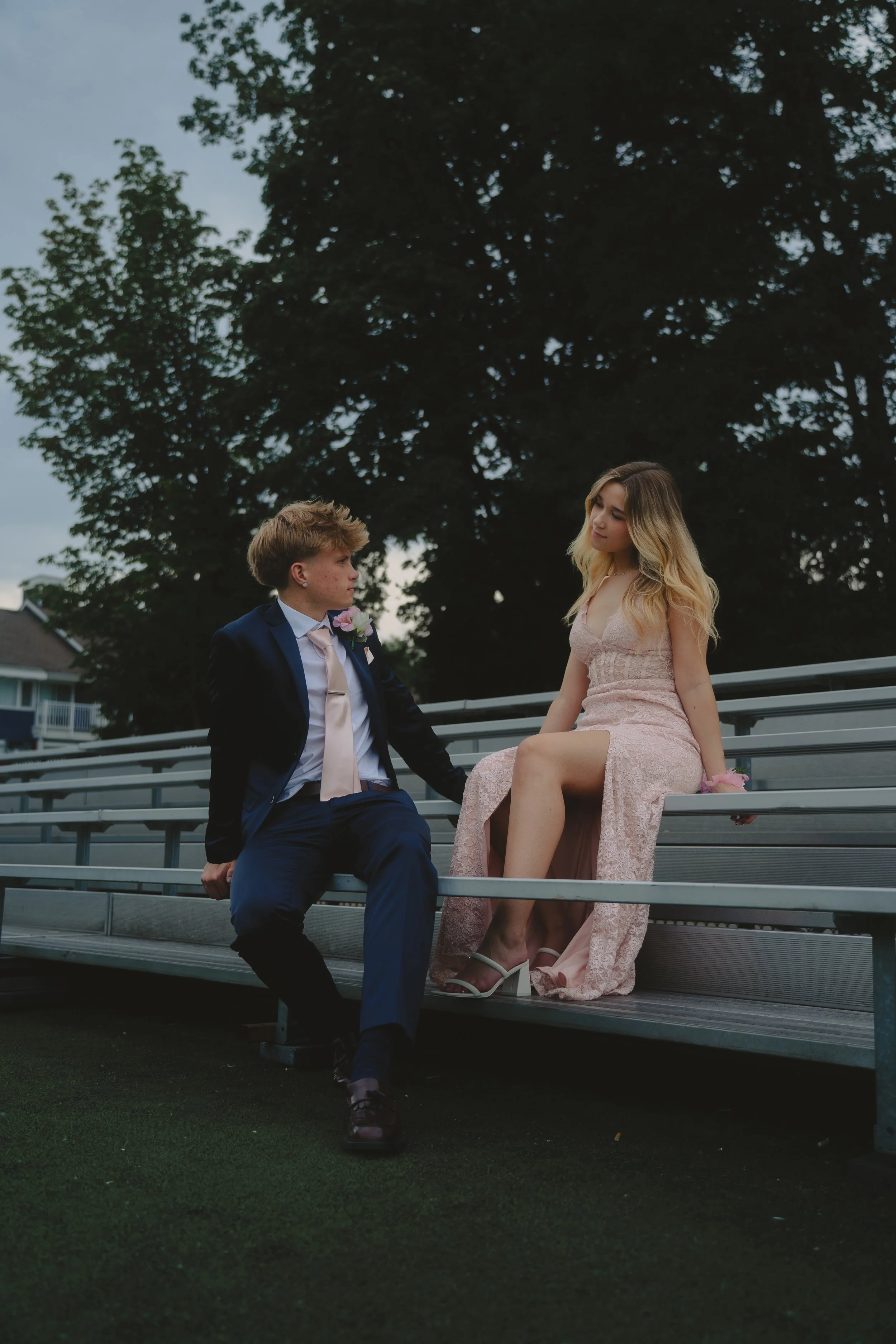 Two women in evening gowns sitting on a bench in a garden, surrounded by greenery and pink flowers. View fullsize