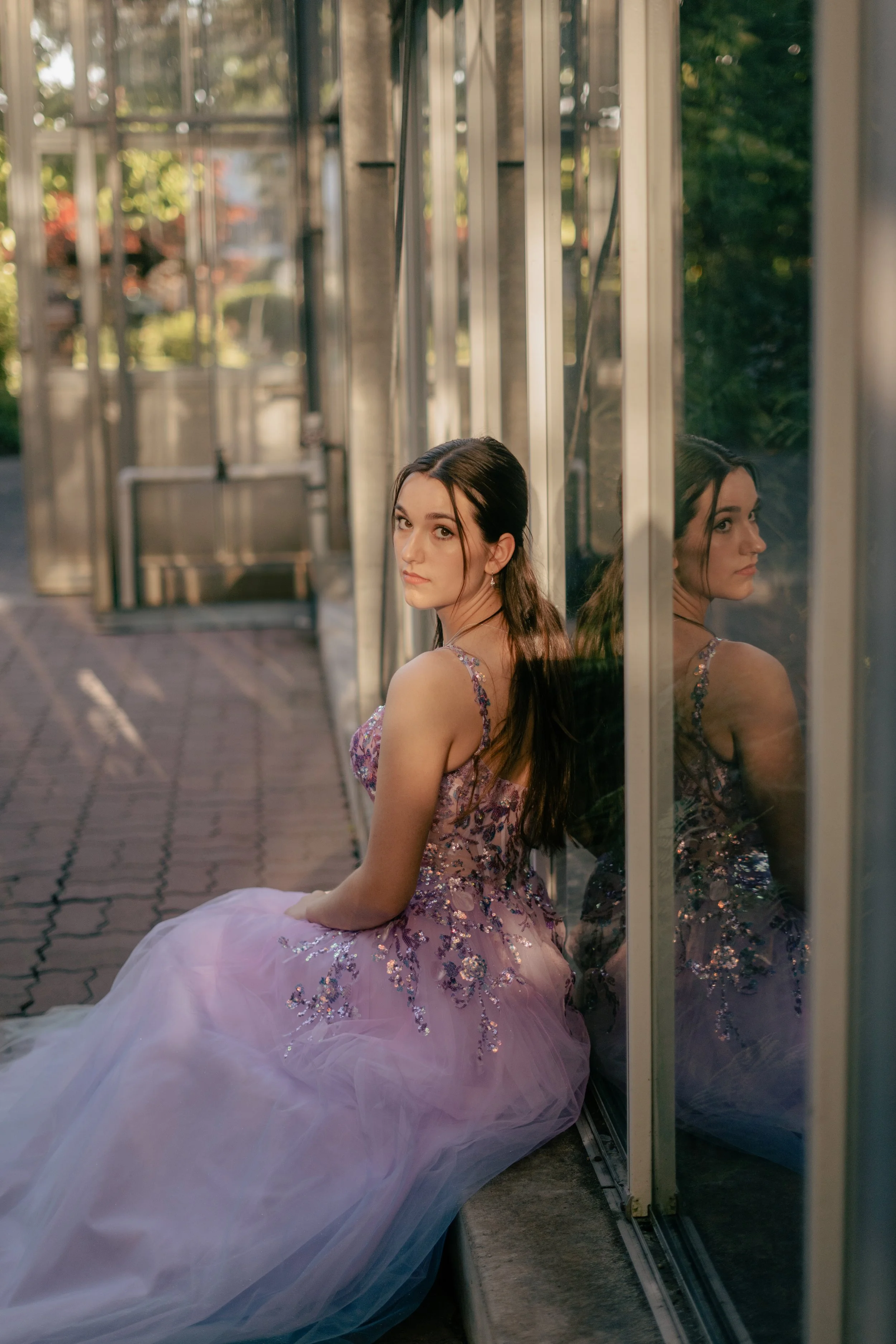Woman in a lilac gown sitting by a glass wall, reflected on the surface, outdoors in sunlight.