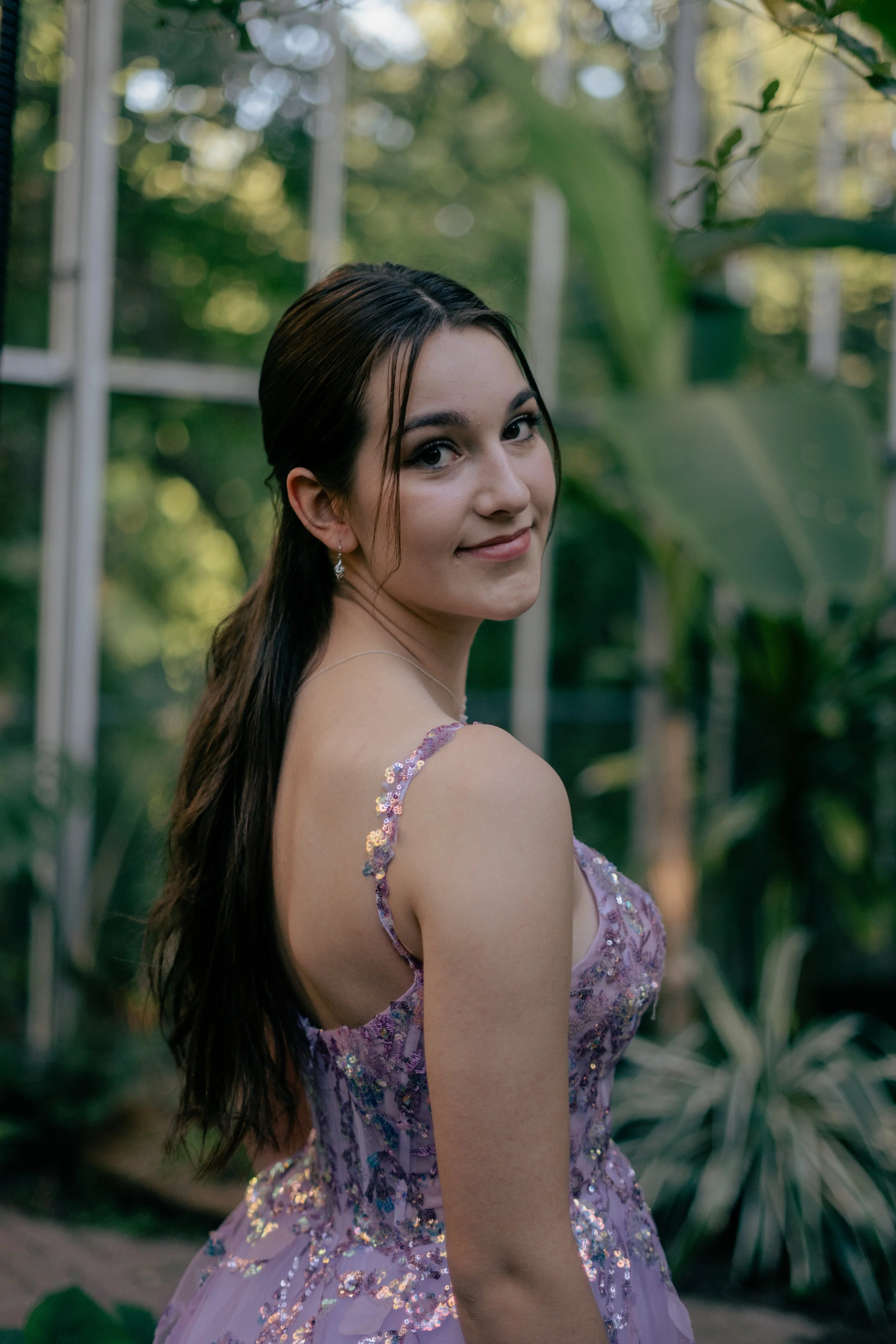 Woman in a sparkling lilac gown stands in a lush greenhouse surrounded by tropical plants.