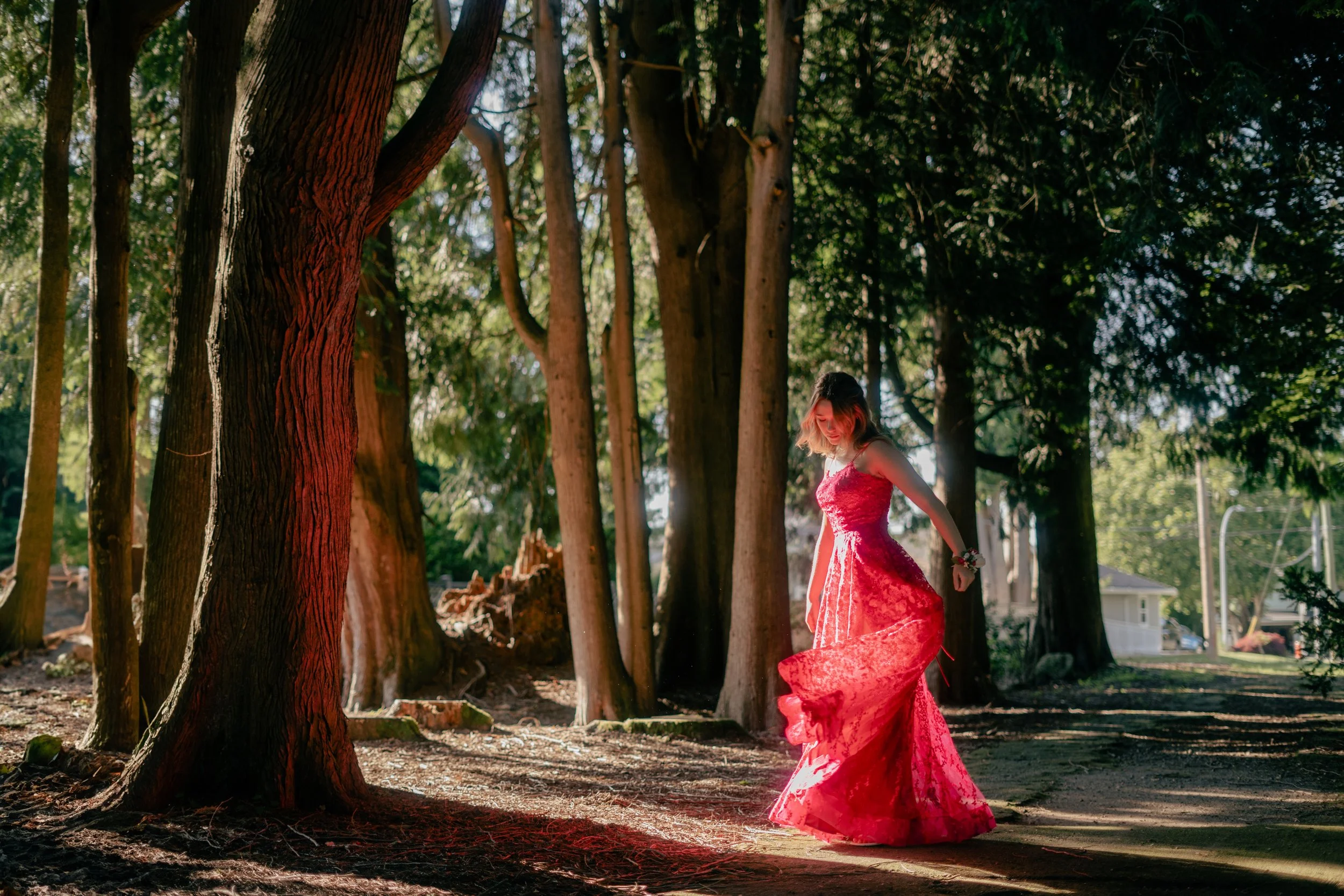 Woman in red dress walking in a forest, sunlight filtering through trees