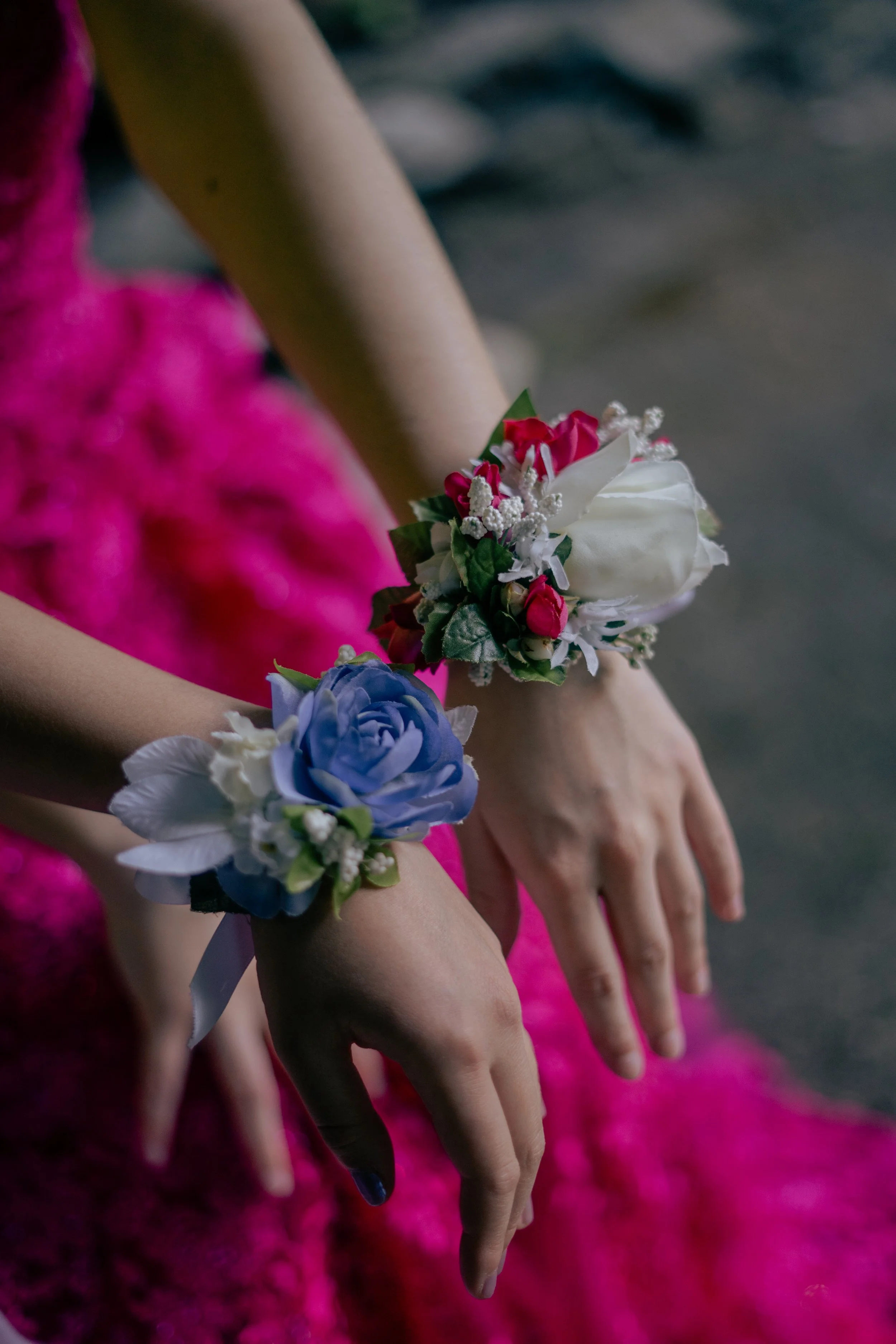 Close-up of two wrists adorned with colorful floral corsages, one with a blue flower, the other with red and white flowers, against a background of a pink dress.