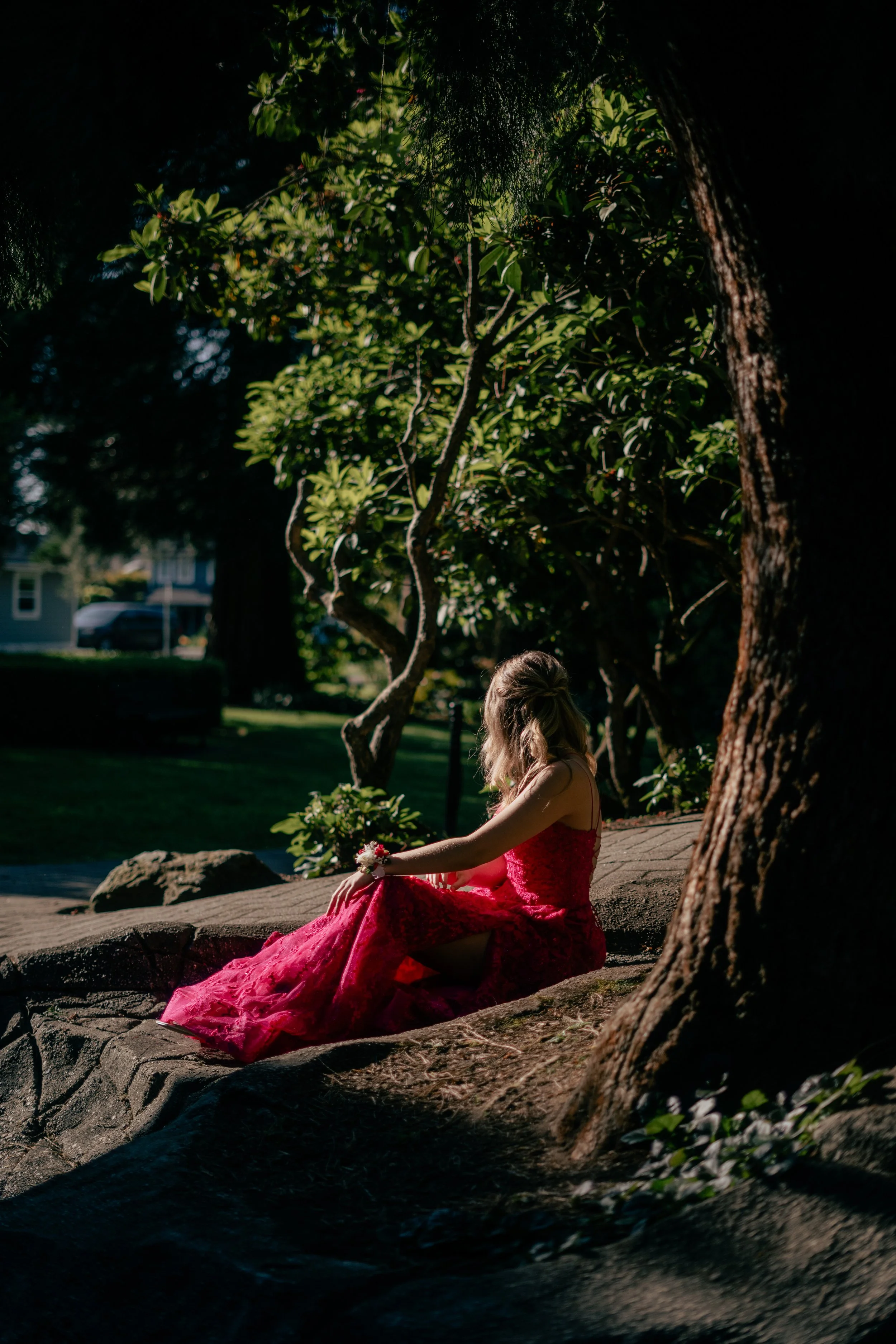 Woman in red dress sitting outdoors near trees
